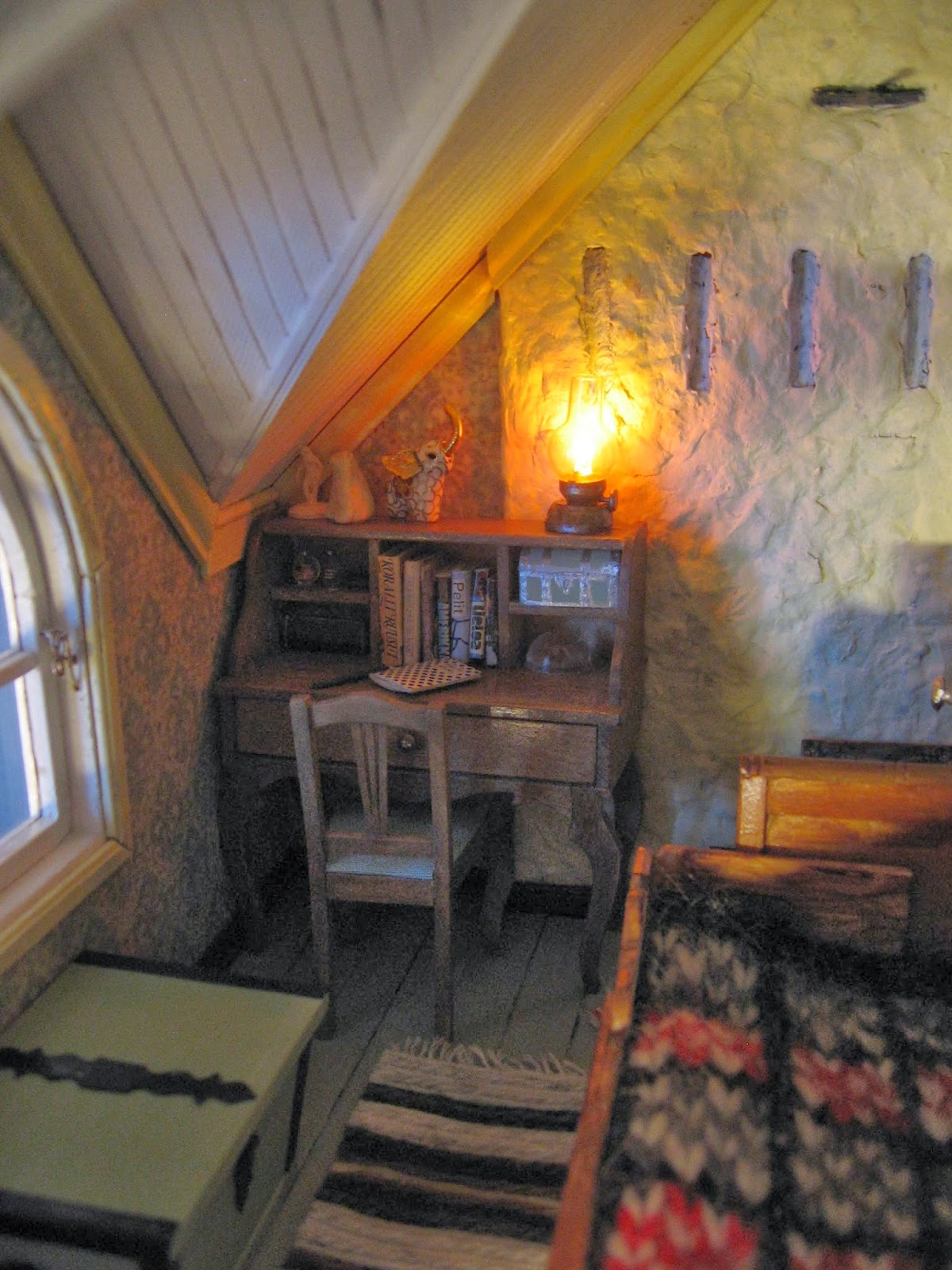 Päätin heti alkaessani rakentaa tätä nukkekotia, ettei siihen tule sähköjä - joko siellä eletään vanhaa aikaa tai sitten muuten vain niin yksinkertaisesti tai eristäytyneinä, ettei ole nykyajan mukavuuksia. Myöhemmin on kuitenkin alkanut tuntua, että joku valo voisi tuoda tunnelmaa, vaikka "öljylamppu". Talossa ei ole takaseinää siten kuin nukkekodeissa yleensä, vaan se on joka puolelta katseltavissa, joten johtojen piilottaminen jälkikäteen ei oikein helposti onnistuisi. Onneksi on keksitty patteritoimiset led-lamput. Ostin sellaisen ihan valmiina ja sijoitin makuuhuoneeseen.